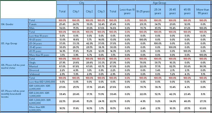 Presenting a survey project result in table format (i.e. crossbreaks and downbreaks) for comparison, interpretation and building reports, using SPSS for data processing and Excel as output method.The raw data was processed and cleaned in SPSS before creating tables. Necessary variables added/modified for analysis purposes. For example, the age input changed from an open-ended format to a group response to enhance interpretation.All variables of interest are placed in row and column levels. The output was set as column %. The table was extracted to Excel format in the final step.