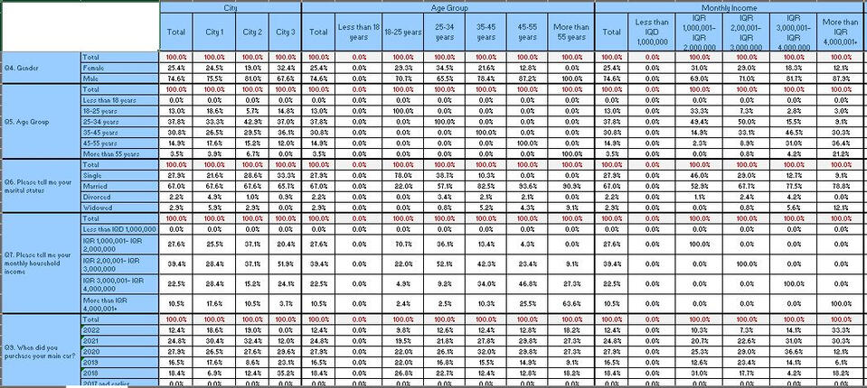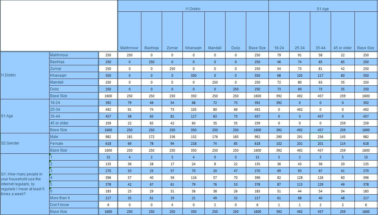 Presenting a survey project result in table format (i.e. crossbreaks and downbreaks) for comparison, interpretation and building reports, using SPSS for data processing and Excel as output method.The raw data was processed and cleaned in SPSS before creating tables. Necessary variables added/modified for analysis purposes. For example, the age input changed from an open-ended format to a group response to enhance interpretation.All variables of interest are placed in row and column levels. The output was set as column %. The table was extracted to Excel format in the final step.