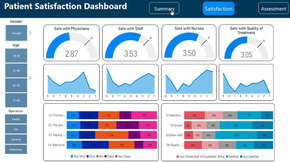This interactive report was created for a hospital satisfaction survey program using Power BI.The following steps needed for implementing this project:- A questionnaire was developed and programmed using survey monkey.- A pilot test was run, the collected data was processed using Power BI query.- A final dashboard and key metrics were developed upon hospital demands, such as Avg. Satisfaction with Physicians, Nurses, Staff, and overall quality of the treatment.
