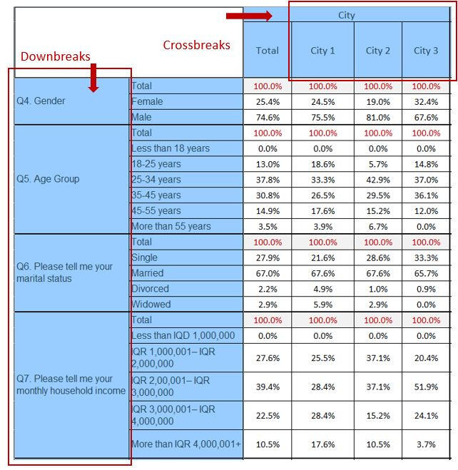 Presenting a survey project result in table format (i.e. crossbreaks and downbreaks) for comparison, interpretation and building reports, using SPSS for data processing and Excel as output method.The raw data was processed and cleaned in SPSS before creating tables. Necessary variables added/modified for analysis purposes. For example, the age input changed from an open-ended format to a group response to enhance interpretation.All variables of interest are placed in row and column levels. The output was set as column %. The table was extracted to Excel format in the final step.