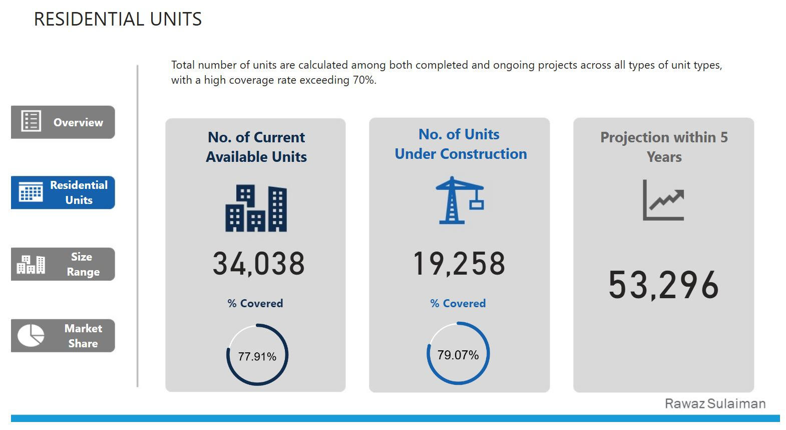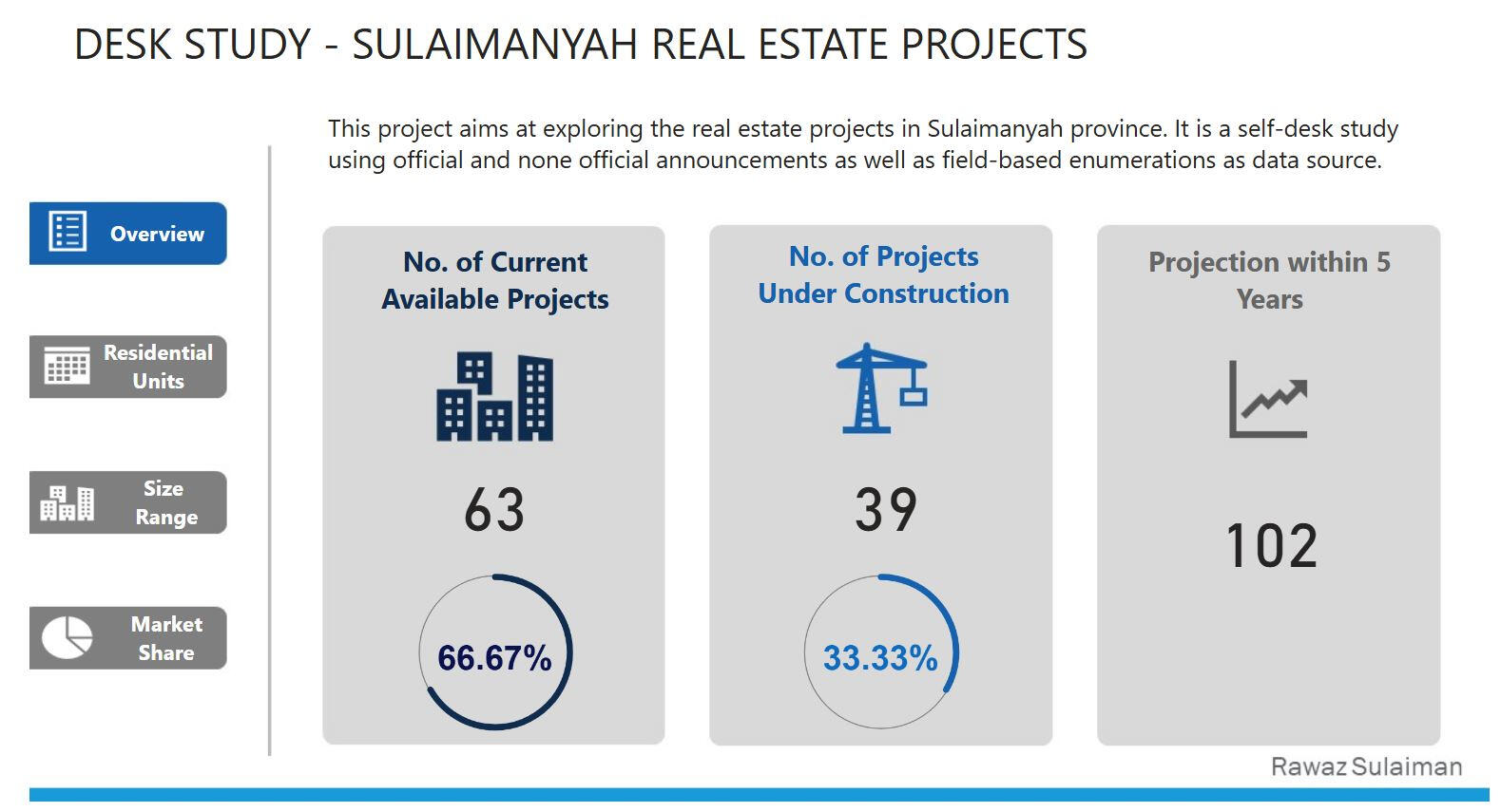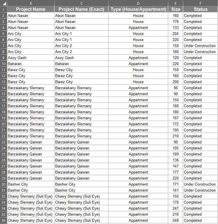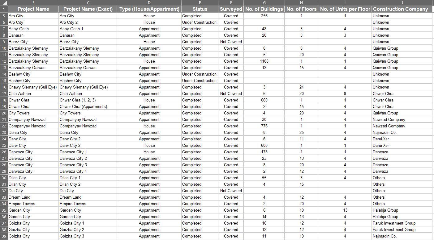 This desk research report tries to provide an overview of the real estate market in Sulaimanyah, Iraq, by looking at some key metrics for both completed and ongoing projects.These metrics include the total No. of projects and units along with customer preferences regarding residential unit selection.- First, the raw data was provided in tabular format, i.e. Excel tables. These included; project name, type, size, status, No. of buildings, No. of floors and number of units.