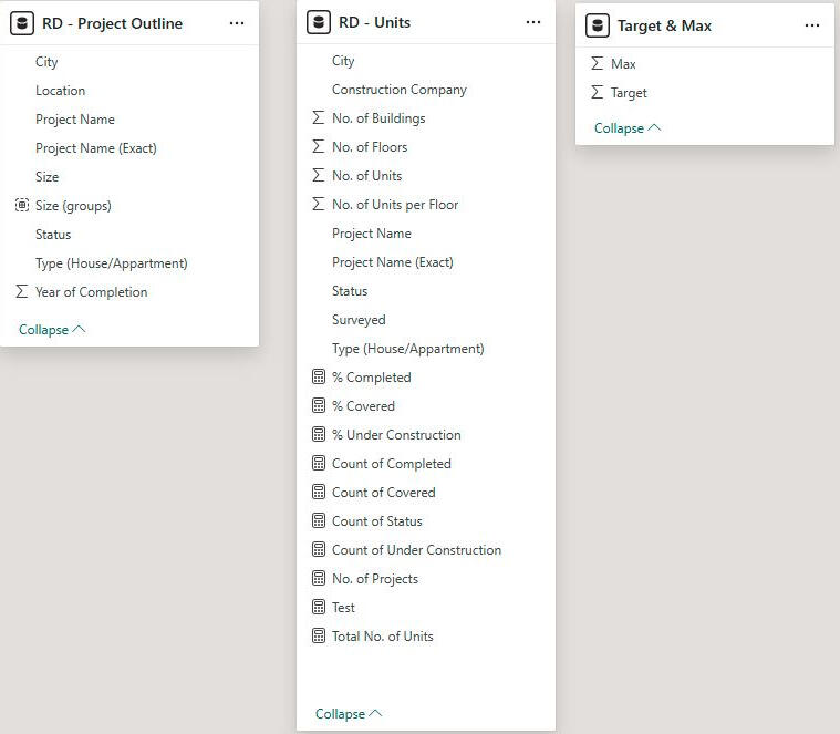 - The raw data was processed and transformed using power query within Power BI. Specific measures were added to the data model using DAX expressions; chief of which are % completed & % under construction, no. of projects, etc.Below are some examples of the used DAX expressions:* No. of Projects = DISTINCTCOUNT('RD - Project Outline'[Project Name (Exact)])* Total No. of Units = SUM('RD - Units'[No. of Units])* Count of Completed = CALCULATE(COUNT('RD - Units'[Status]),'RD - Units'[Status]="Completed")* Count of Covered = CALCULATE([Count of status],'RD - Units'[Surveyed]="Covered")* % Completed = DIVIDE([Count of Completed],[Count of Status])